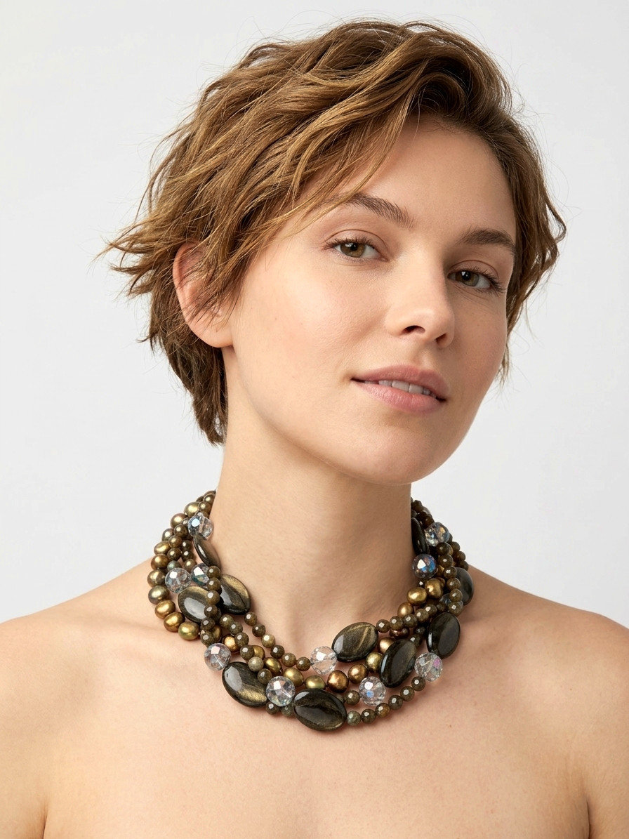 Collar de cuatro vueltas de piedras y perlas montado en hilo color oliva, cierre de palanca de plata.