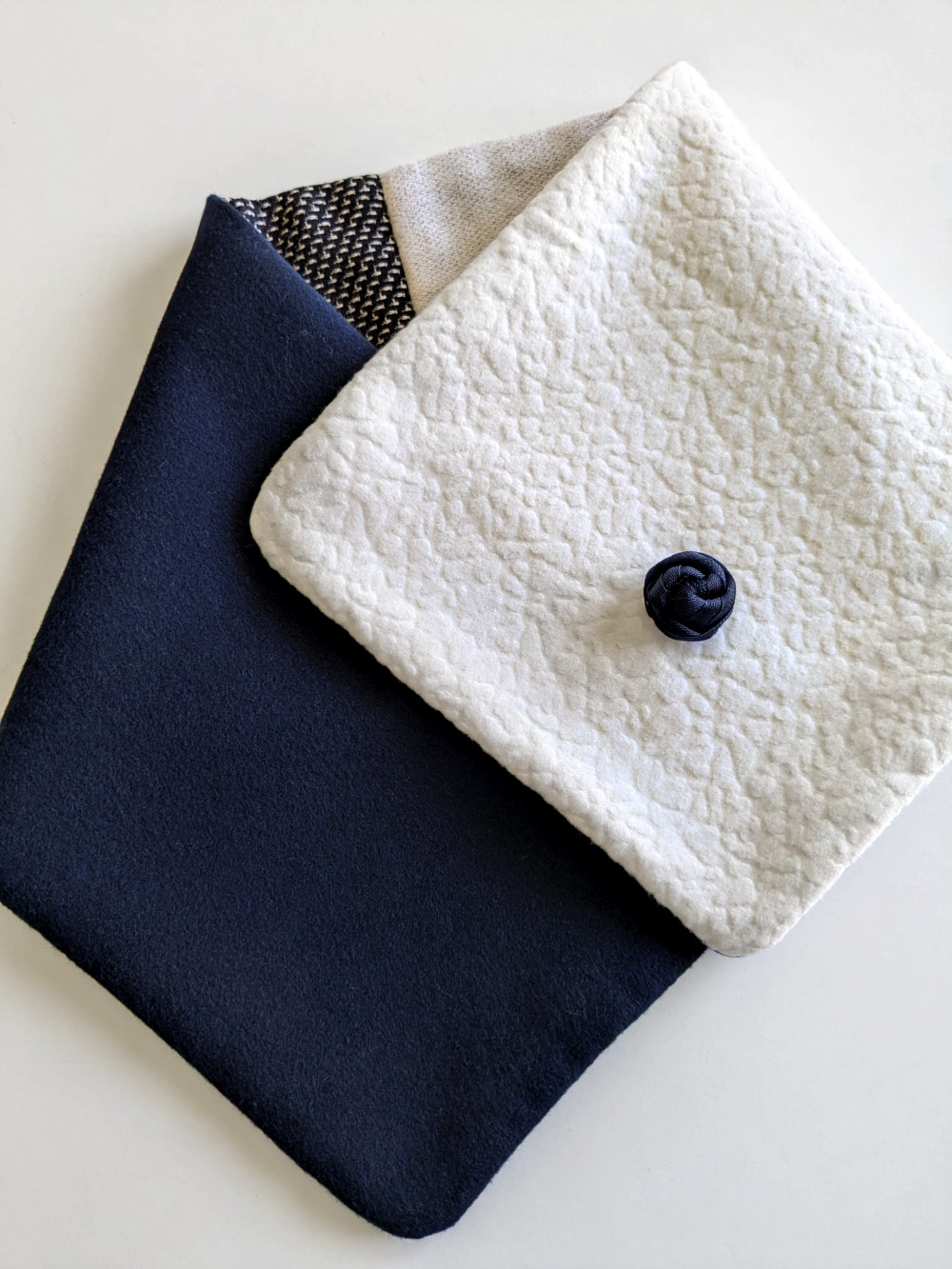 Cuello elaborado combinando telas suaves, densas y flexibles en tonos azul marino y hueso. El botón se ha seleccionado en especial para cada pieza de una colección de años. Forro interior combinado en las mismas tonalidades con botón de refuerzo.