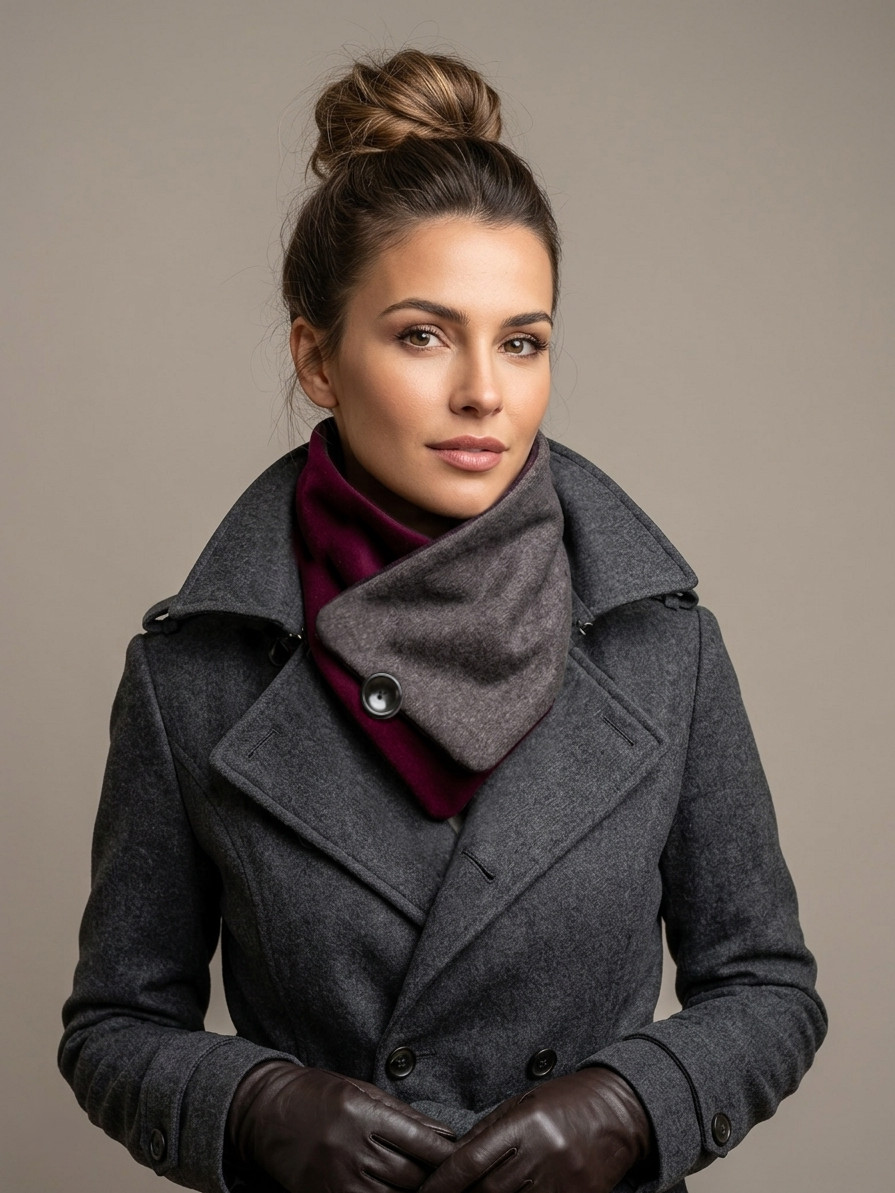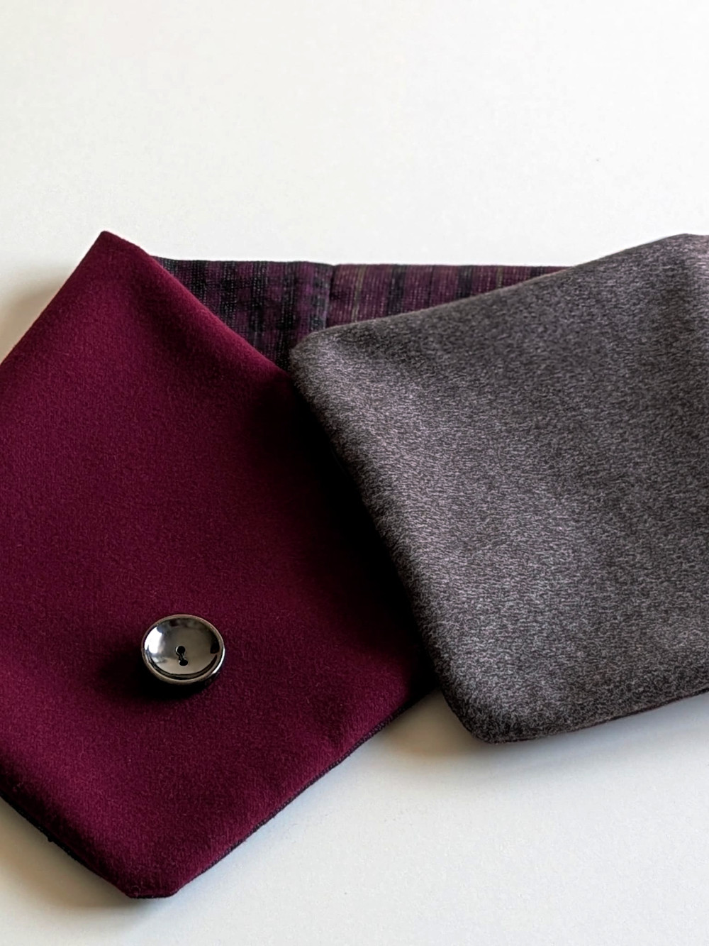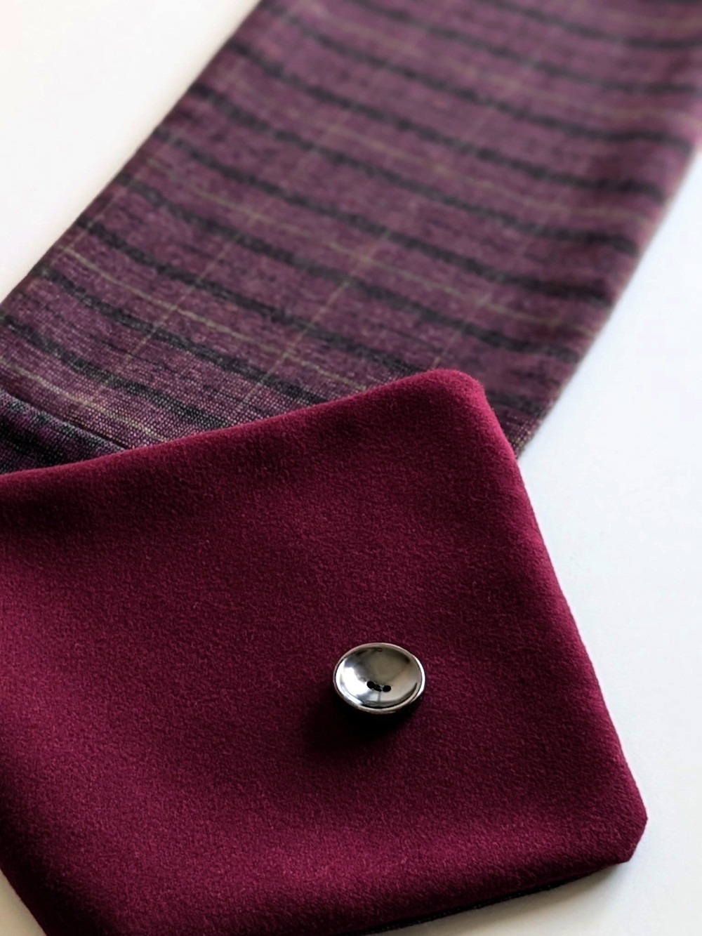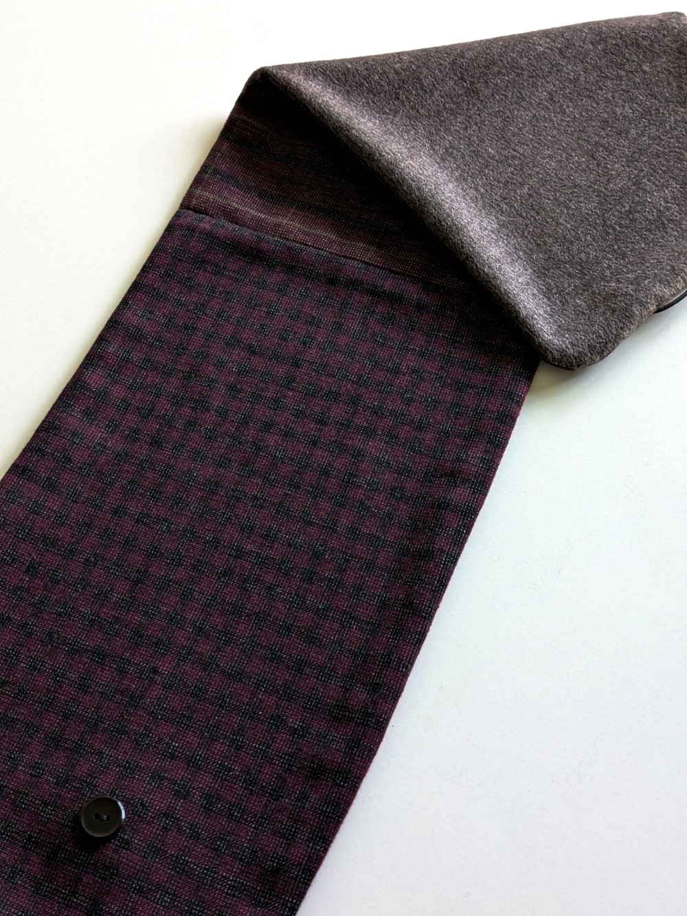 Cuello elaborado combinando telas suaves, densas y flexibles en tonos burdeos y gris acero. El botón se ha seleccionado en especial para cada pieza de una colección de años. Forro interior combinado en las mismas tonalidades con botón de refuerzo.