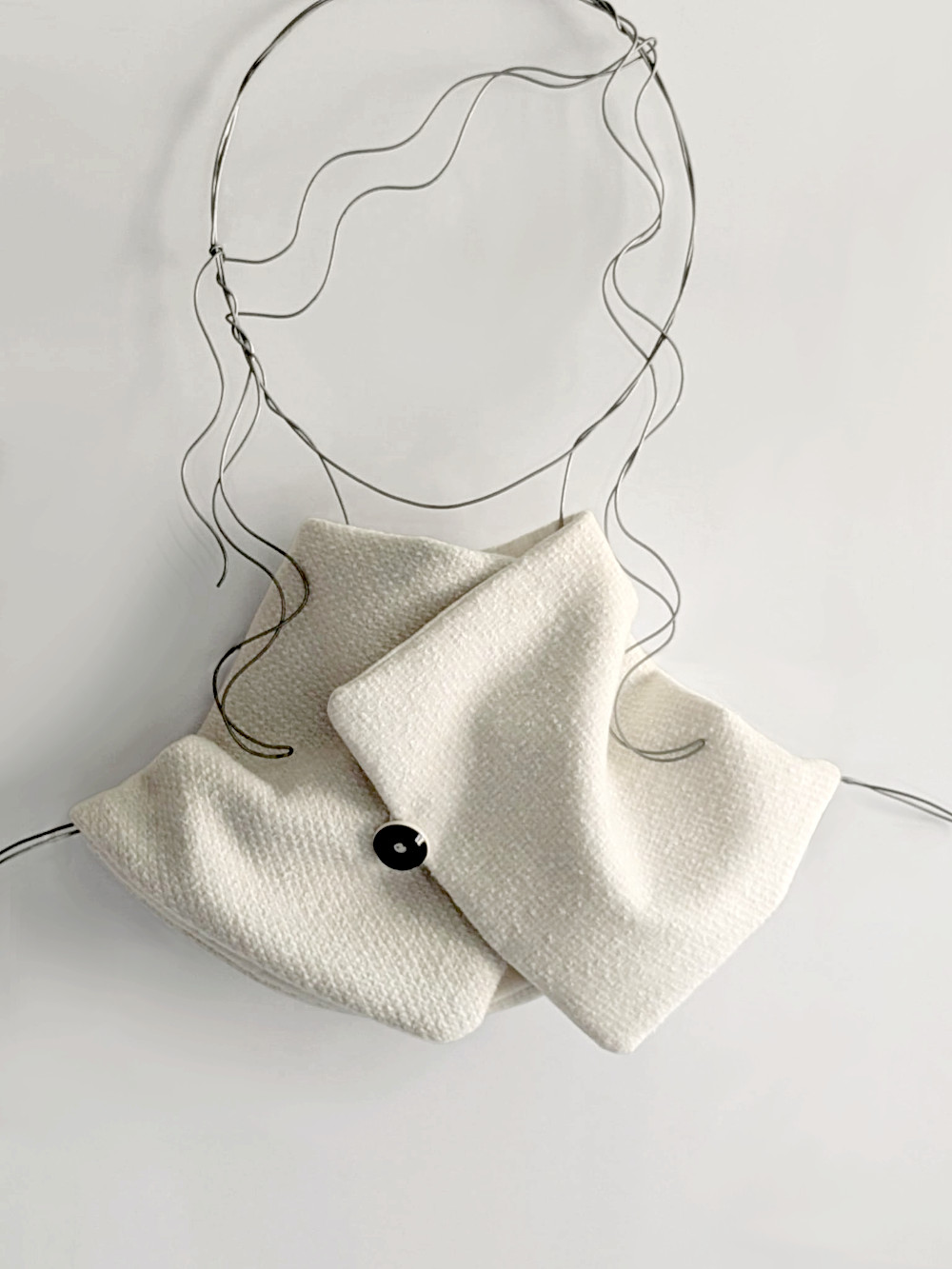 Cuello elaborado combinando telas suaves, densas y flexibles en tonos azules y grises. Forro interior combinado en las mismas tonalidades. El botón se ha seleccionado específicamente para cada pieza de una colección de años.