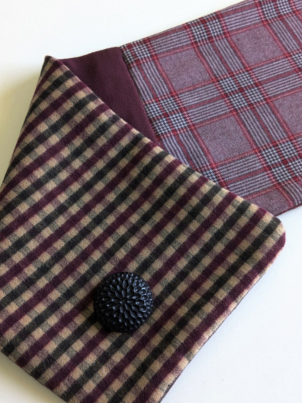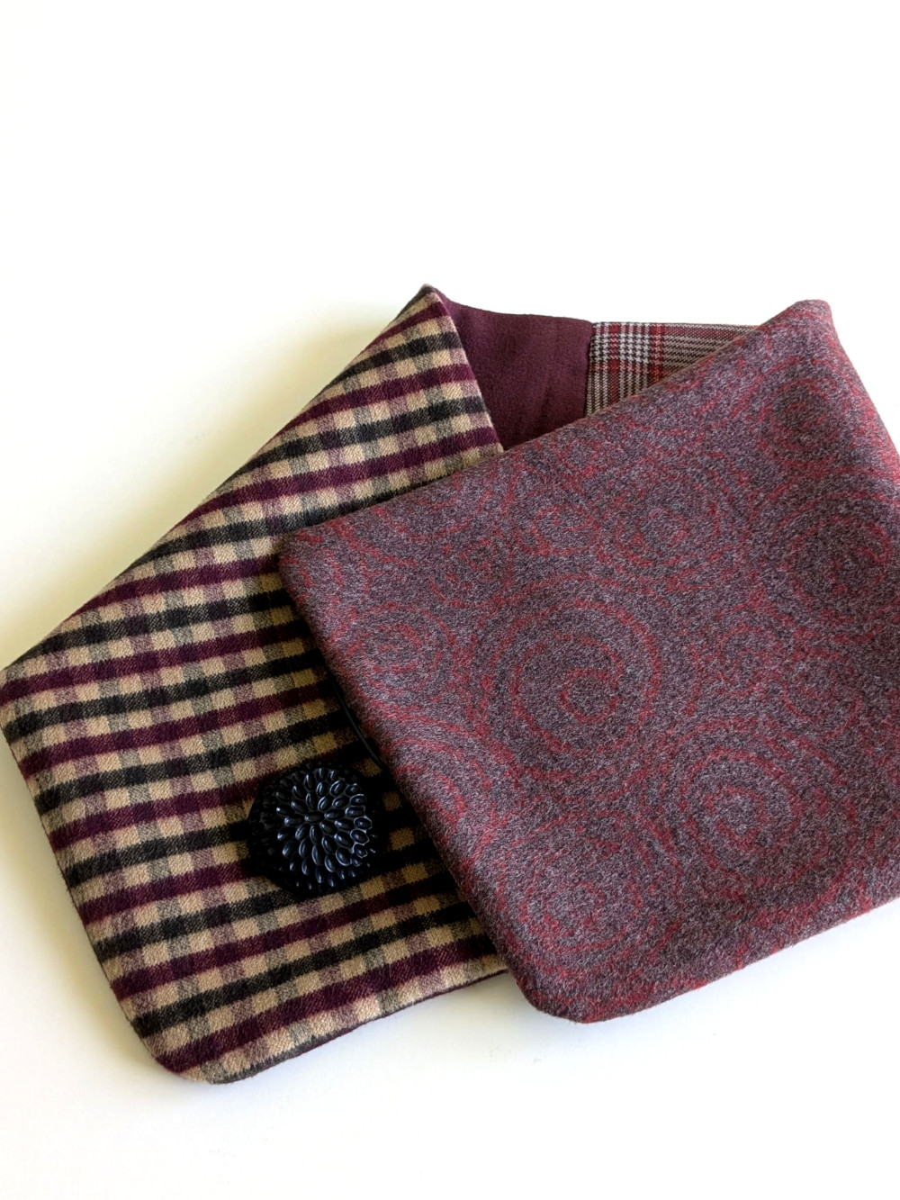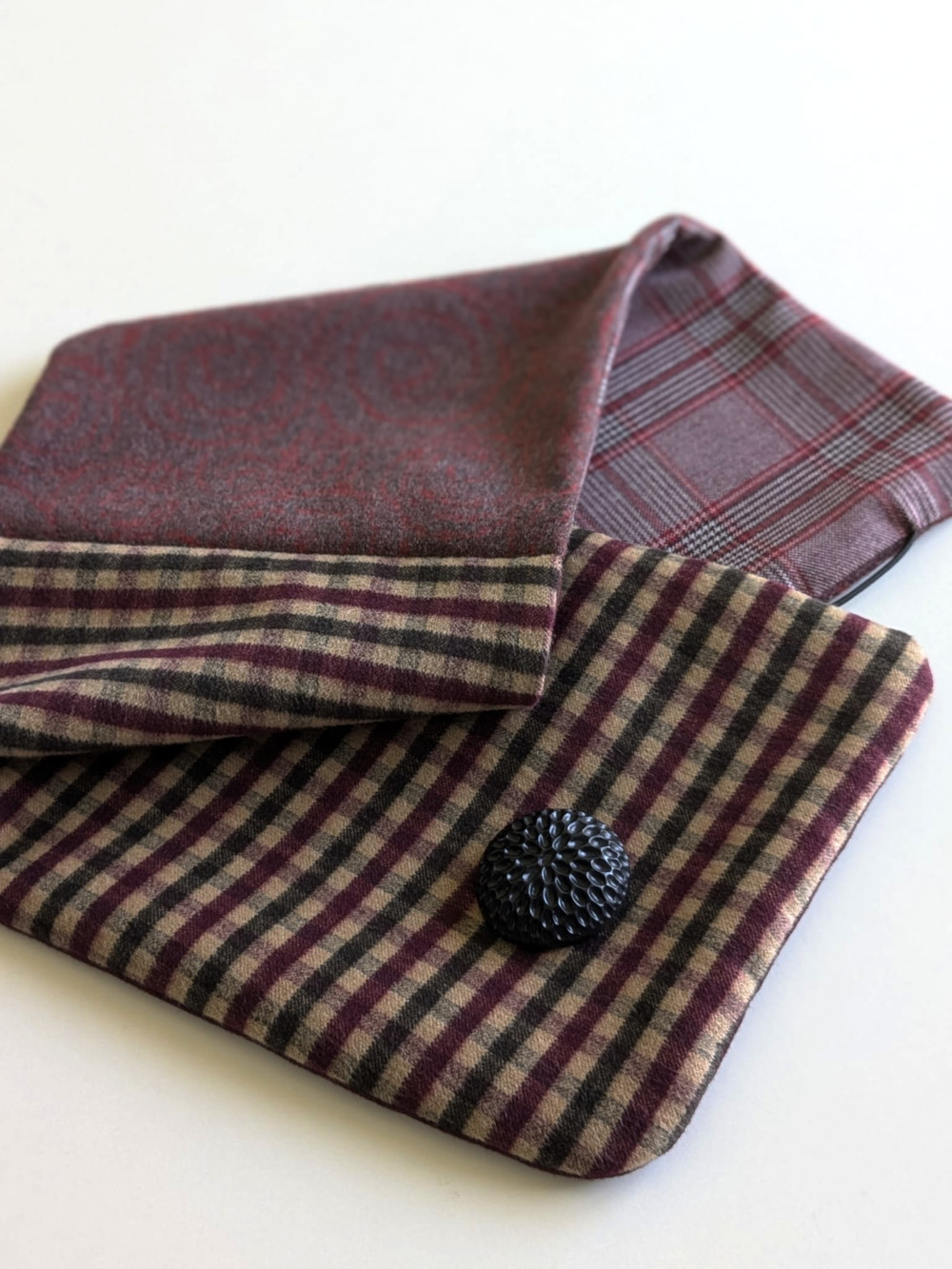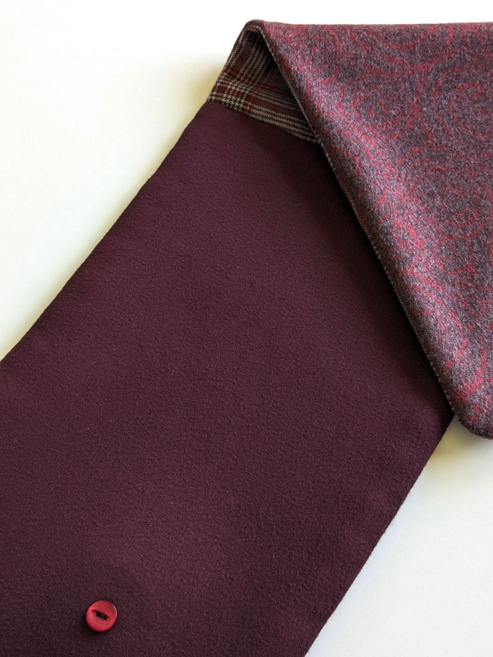 Cuello elaborado con telas de suaves, densas y flexibles en tonos granates. El botón se ha seleccionado en especial para cada pieza de una colección de años. Forro interior combinado en las mismas tonalidades con botón de refuerzo.
