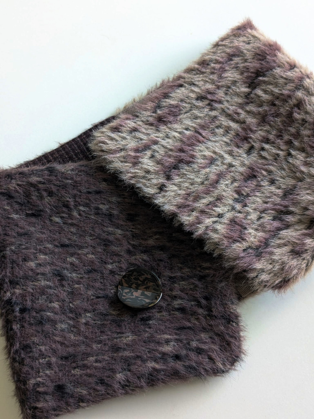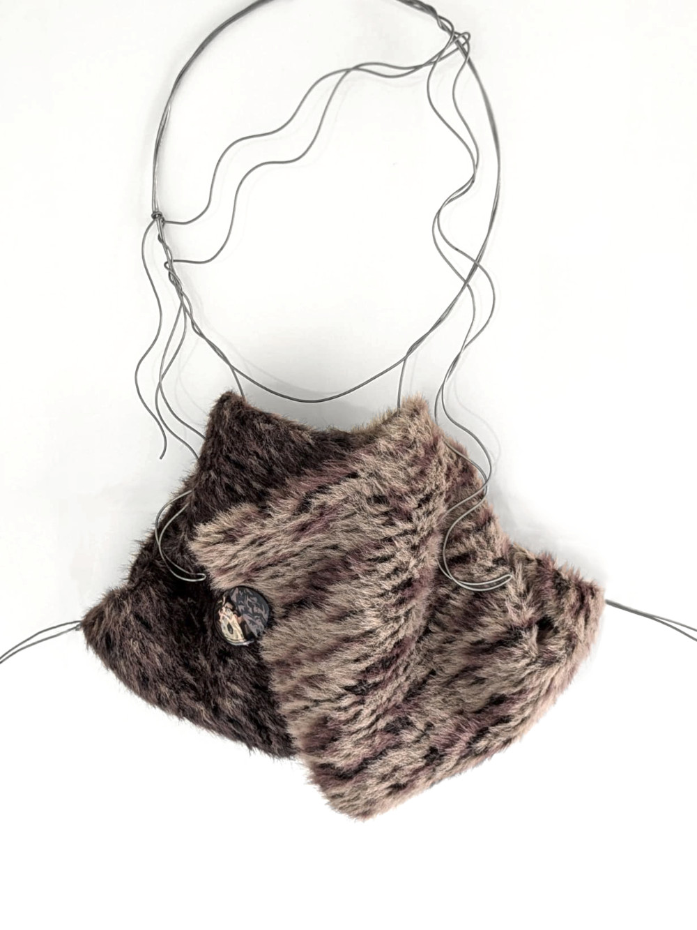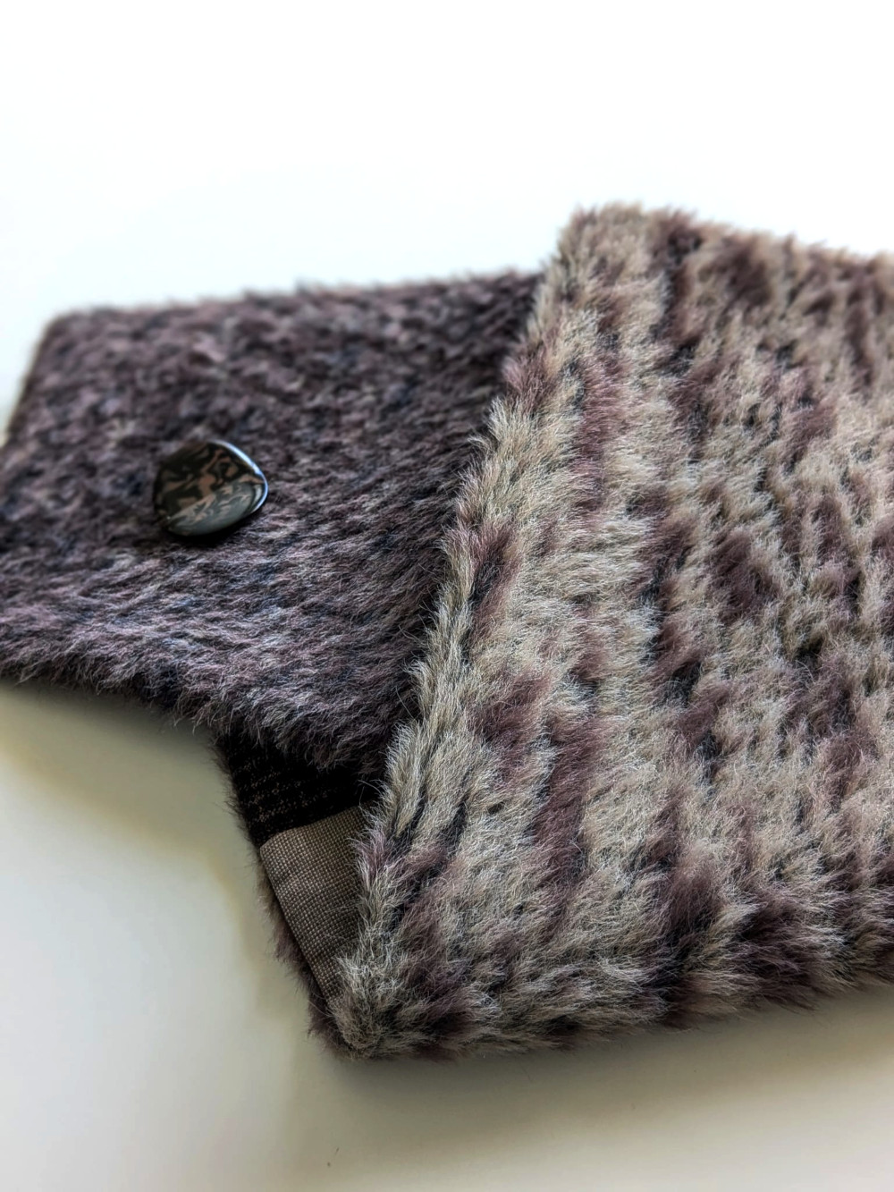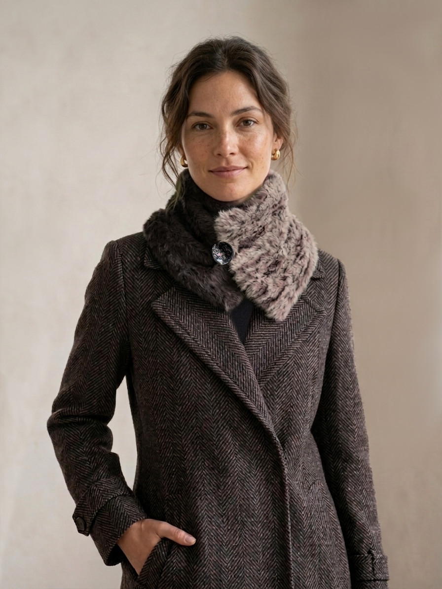 Cuello elaborado con telas de pelo suaves, densas y flexibles en tonos nude. El botón se ha seleccionado en especial para cada pieza de una colección de años. Forro interior combinado en las mismas tonalidades con botón de refuerzo.