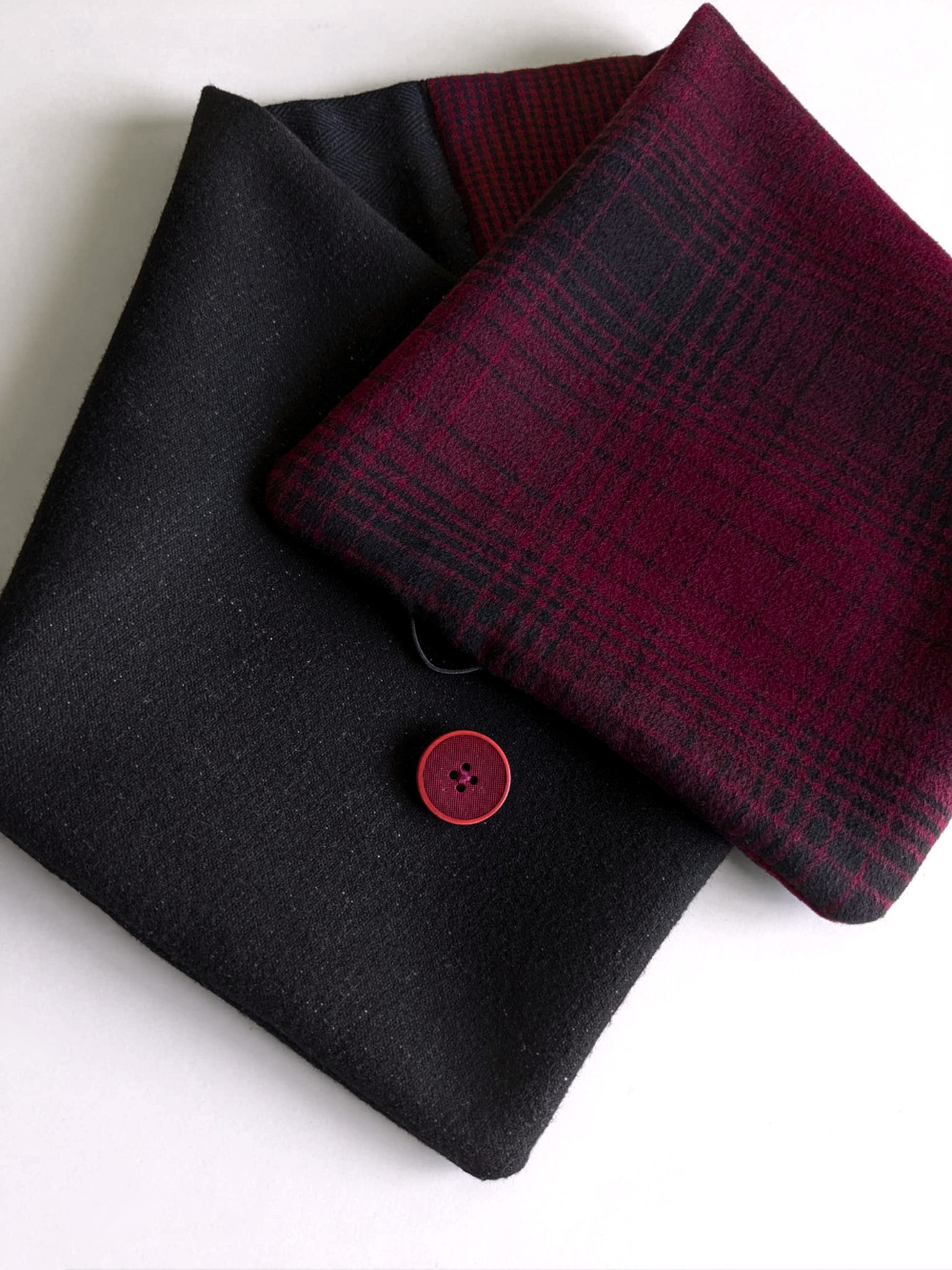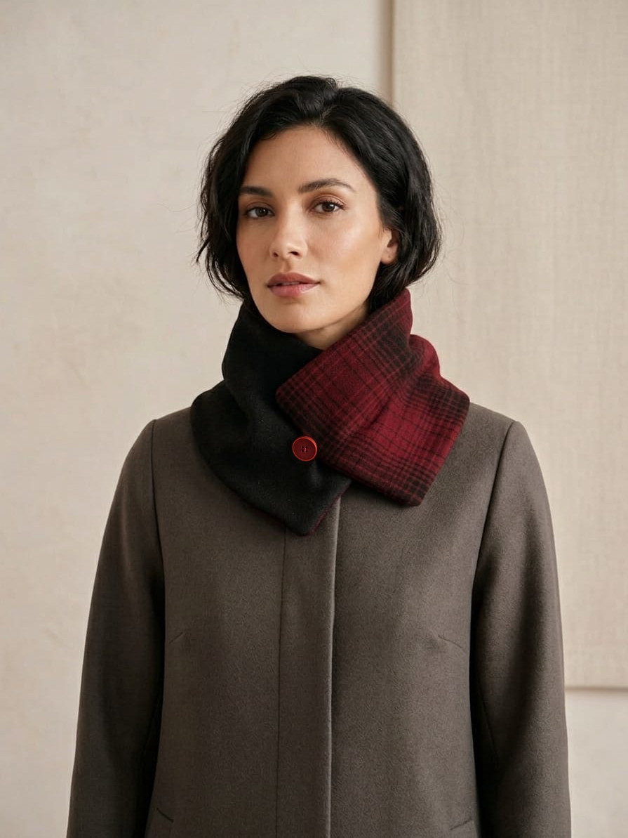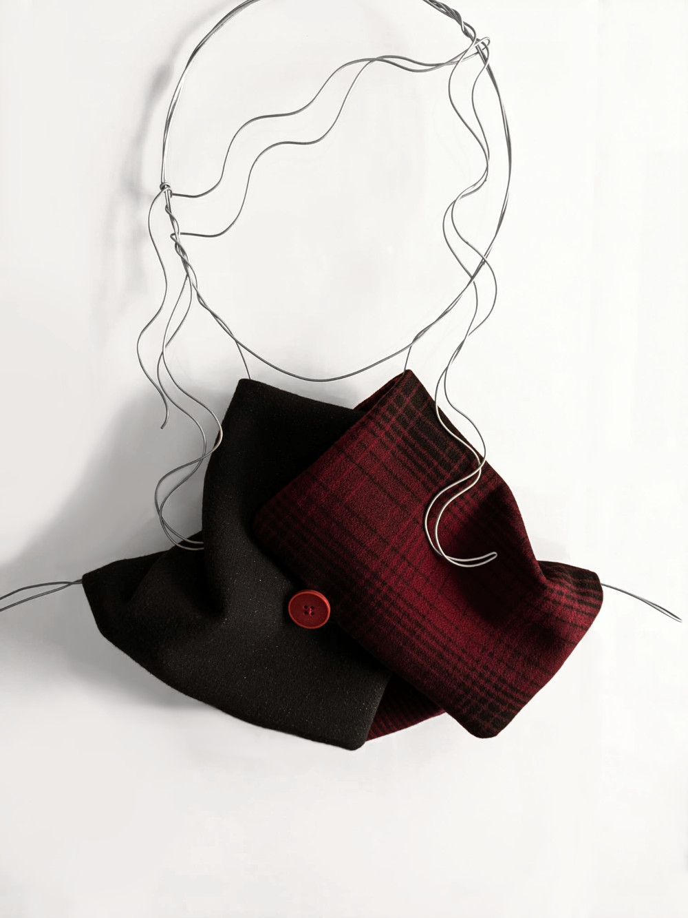 Cuello elaborado con telas suaves, densas y flexibles en tonos rojo y negro con pintas de fibra plateada. El botón se ha seleccionado en especial para cada pieza de una colección de años. Forro interior combinado en las mismas tonalidades con botón de refuerzo.